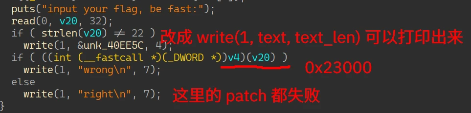 一开始的想法是 emu 在加载时动态修改了程序,故修补程序使之在结束时打印字节码的内容,没有收获,但有个意外发现:在跳到 0x23000 前的 write 函数可以调用成功,之后的所有 patch 全都失效了