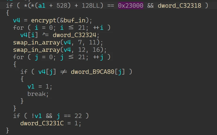 唯一不能确定的是 dword_C32324,不过也不需要确定,直接根据明文是否可读来爆破,实践下来为 10,交叉引用显示这个变量和调试器检测有关