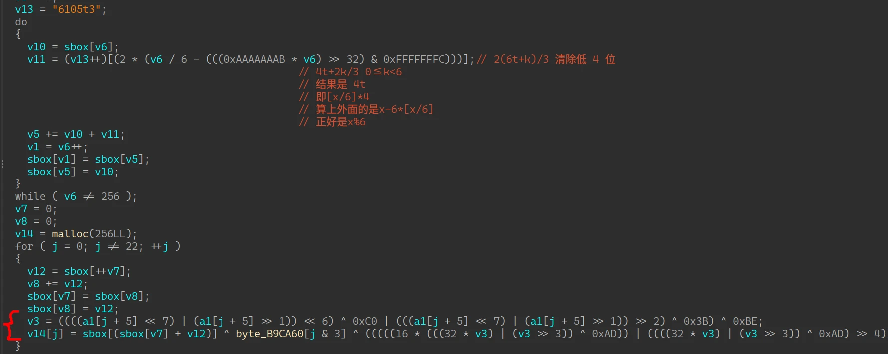 encrypt 函数是一个稍微有点绕的魔改 RC4,KSA 部分使用乘以常数来优化了除法,实际上 KSA 和标准实现一致(见注释),PRGA 也一致,只是最后的加密多做了一些 XOR