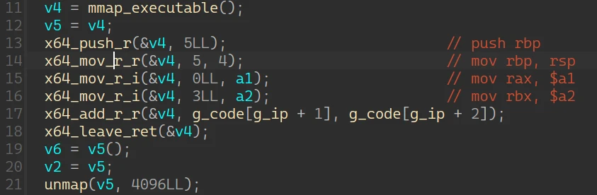 不过这题的派发函数很奇怪,是动态生成机器码来执行的