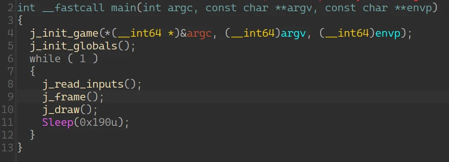 一个快速推断结构体和全局变量的方式是看 draw 函数对它们的处理,容易知道,蛇的初始点为 (10, 10),地图大小为 20x20,食物由假随机(种子 0xdeadbeef)生成,此外,游戏还填充一段可写可执行的内存 xbuf