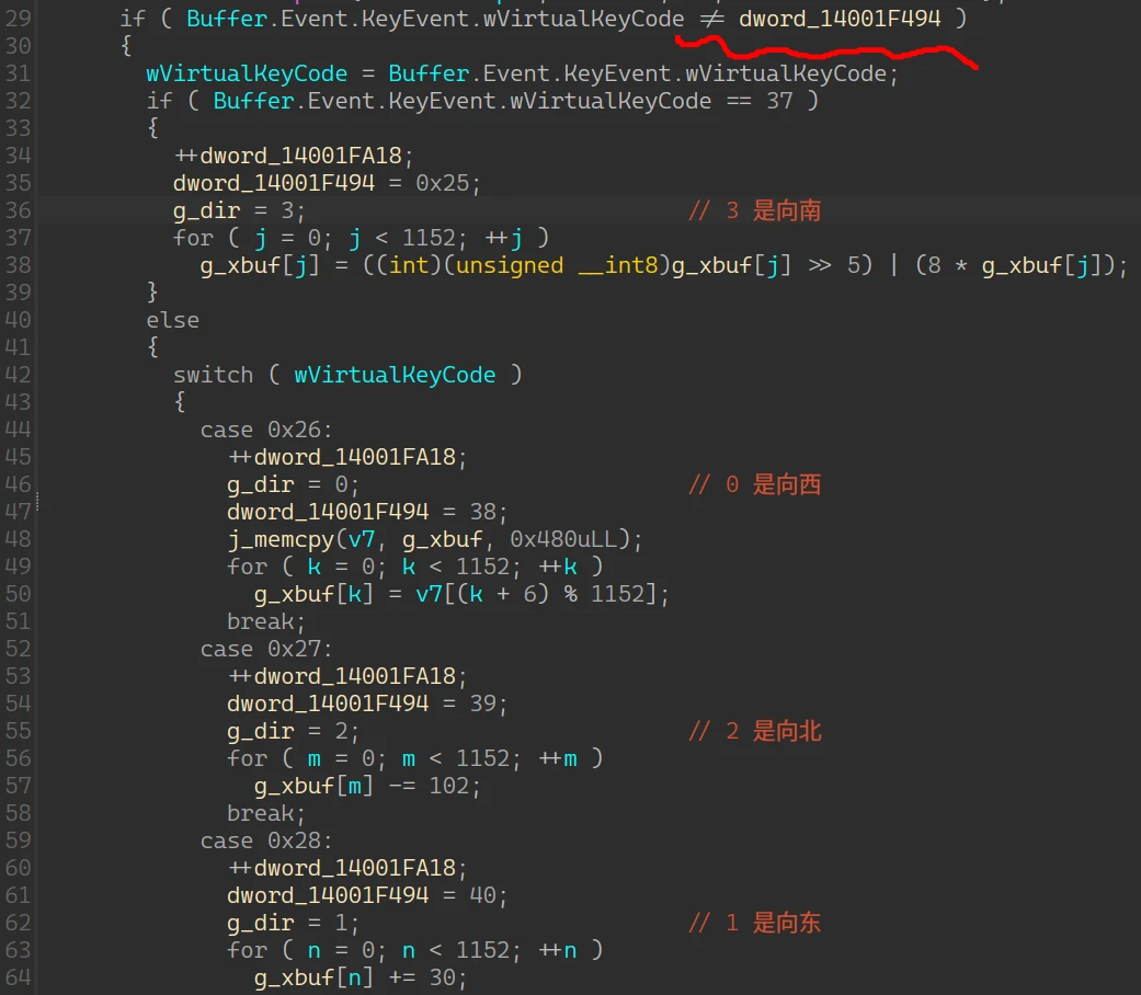 在 read_inputs 处可以看到转向的代码,根据不同的方向,转向时会对 xbuf 进行不同的修改,方向可从帧函数得出