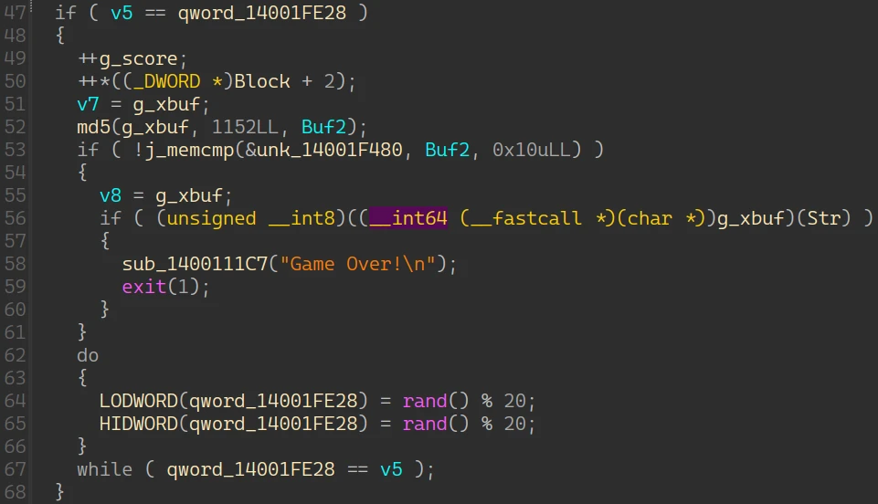在帧函数中可以看到游戏逻辑,吃到食物有特殊处理:如果 xbuf 通过了 md5 校验,则以 nickname 为参数执行之(md5 的常数很明显)
