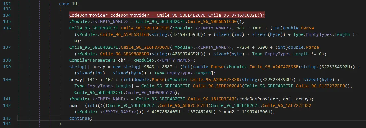 这时注意到状态 1 中有一个 CodeDomProvider,这是用来即时编译源码的类