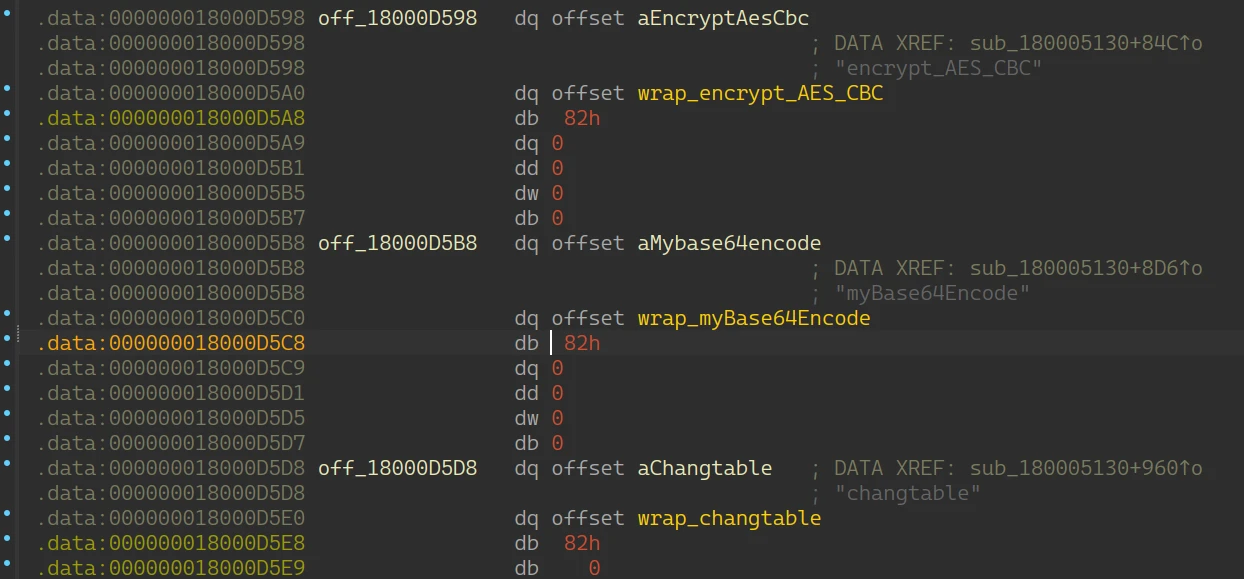 在 .rdata 节可以找到 base64 的初始码表和两个 bytes 常量,32 位的那个显然是 key,16 位的是 iv