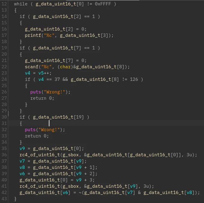 回看 main 函数可以看到 data 数组其实是一个状态机,这个状态机除了输入、输出之外只有一种指令 NAND