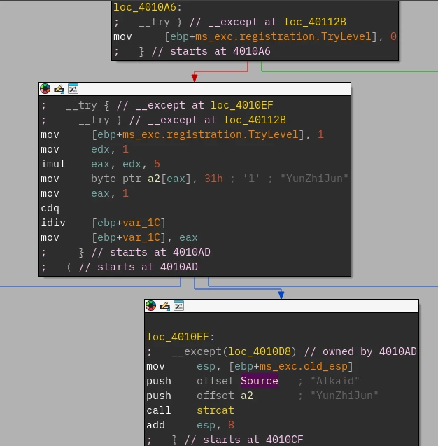 该函数里引用了 RC4 的密钥,并通过除零异常触发 SEH 拼接最终的密钥 YunZh1JunAlkaid