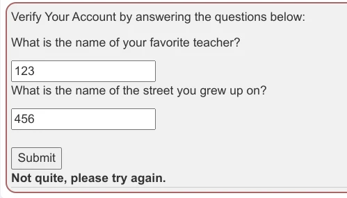 .equals(secQuestionStore.get(verifyUserId).get("secQuestion0"))) {